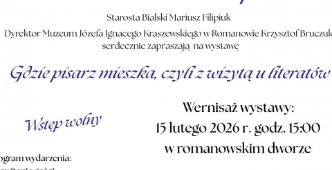 Starosta Bialski Mariusz Filipiuk Dyrektor Muzeum Józefa Ignacego Kraszewskiego w Romanowie Krzysztof Bruczuk zapraszają na wernisaż wystawy Gdzie pisarz mieszka, czyli z wizytą u literatów, który będzie miał miejsce w romanowskim dworze 15 lutego 2026 roku o godz. 15.00 Wystawa organizowana w ra